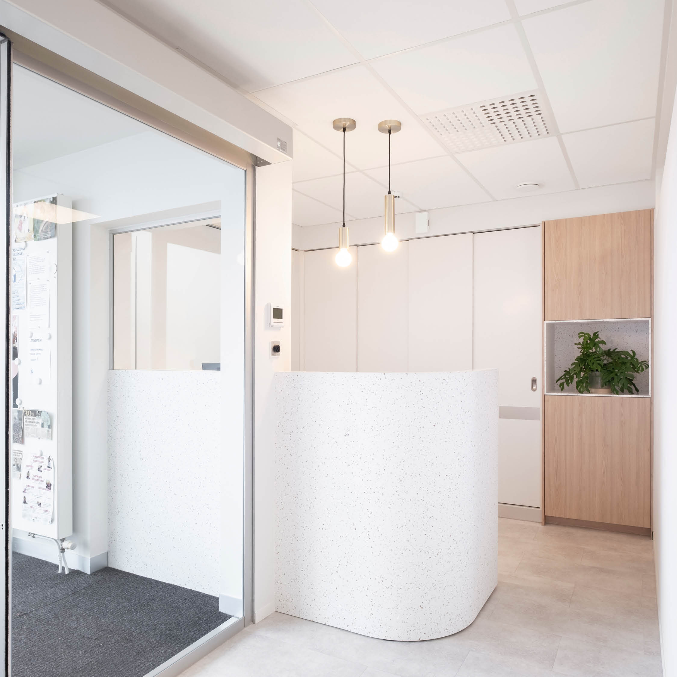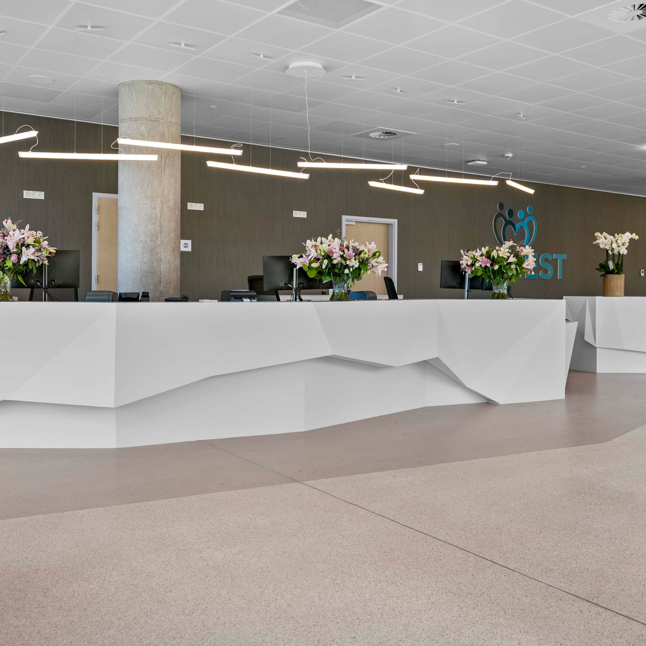 Recepcija nije samo pult — celokupan ambijent gradi iskustvo. Zato se Kerrock koristi i za oblaganje zidova, dajući prostoru elegantan, ujednačen izgled uz istovremeno poboljšanje izdržljivosti površina.
